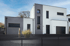 Moderner, dunkelgrauer Lattenzaun vor einem weißen Haus mit dunklem Dach und Solarpaneelen.